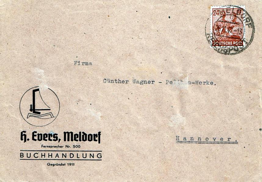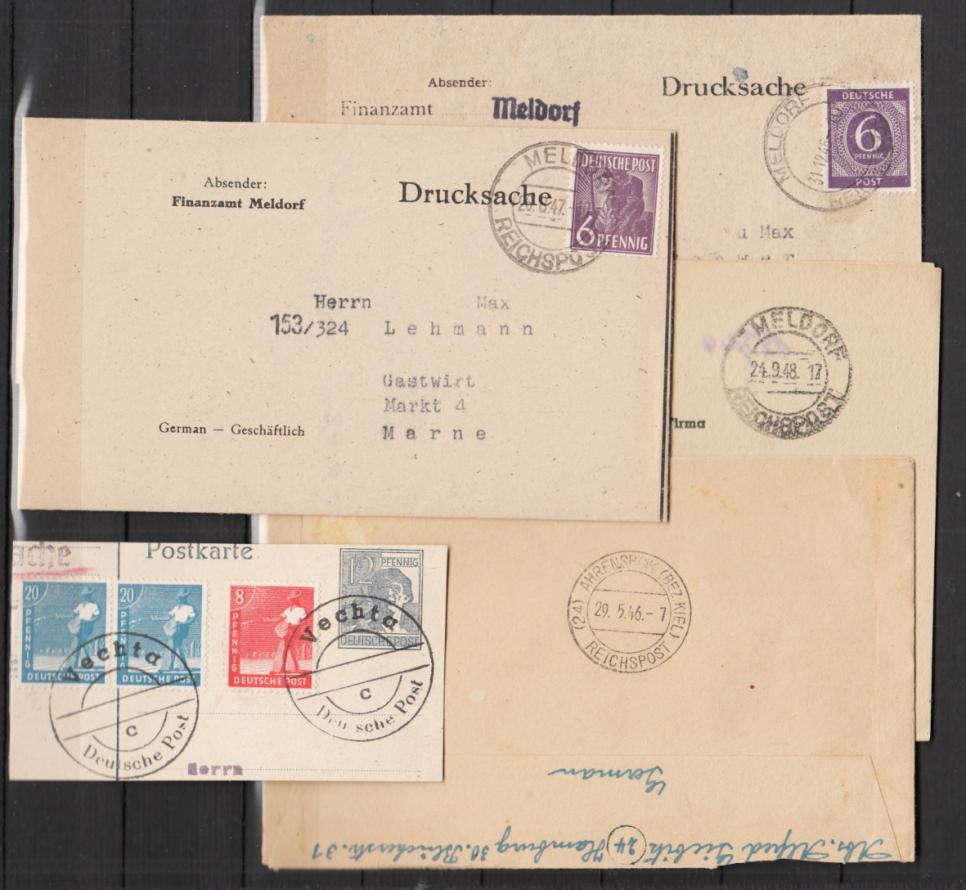 Einer der etwas selteneren Stempel stammt aus Meldorf. Das mir vorliegende Exemplar ist vom 26.11.1947.