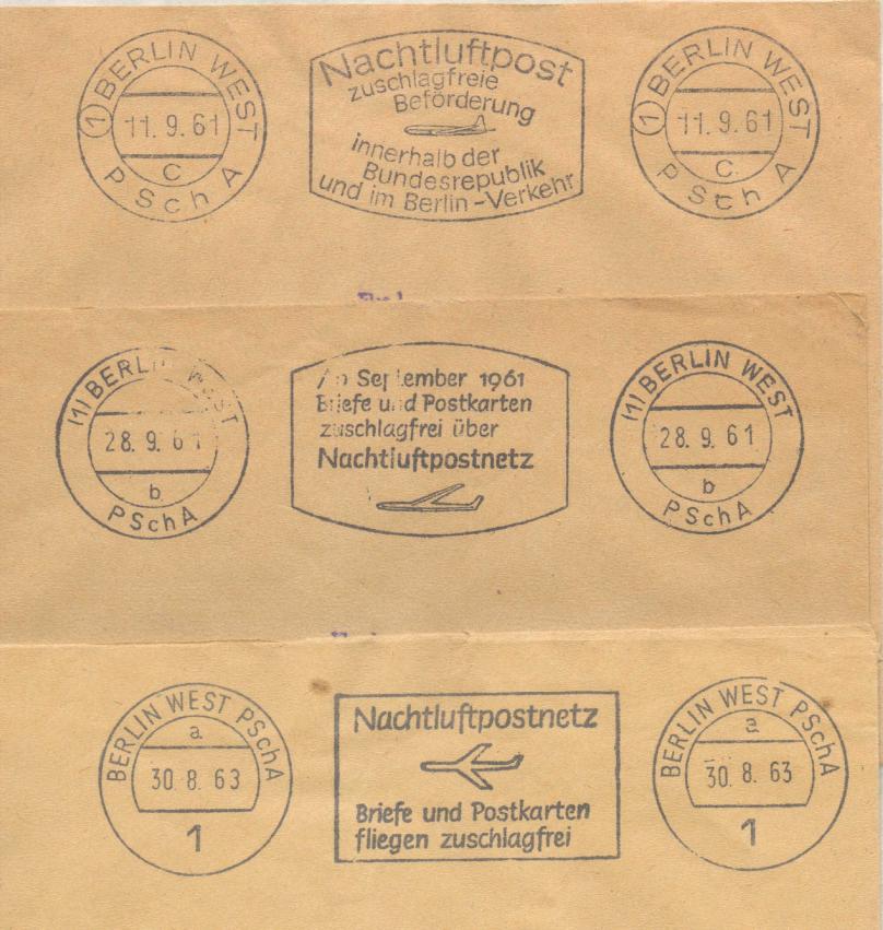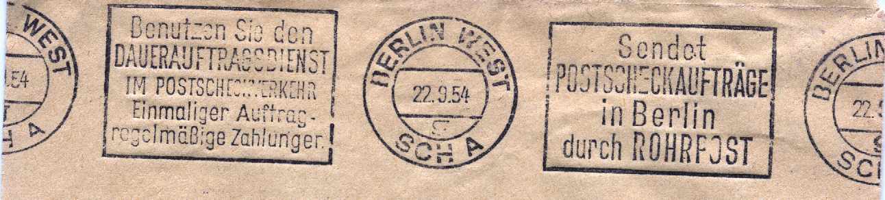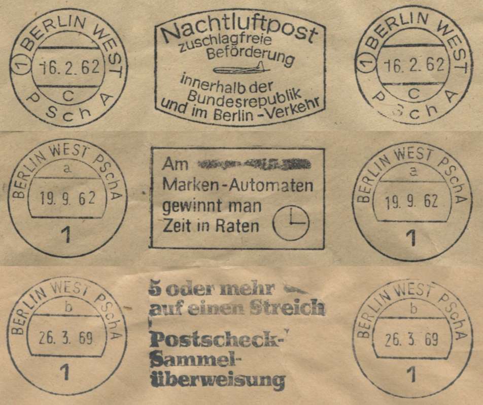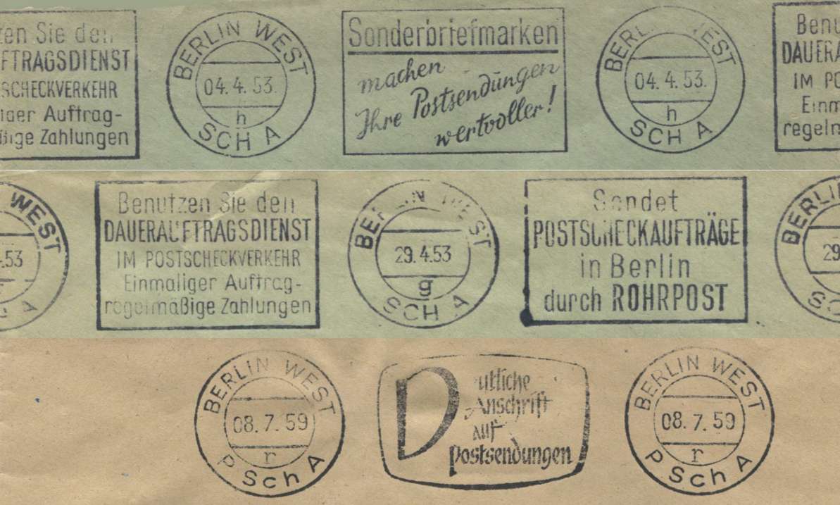 Ich versuche die Verwendungszeiten der Maschinenstempel, die das Postscheckamt Berlin West von seiner Gründung im August 1948 bis zu seinem Umzug an das Hallesche Ufer im Mai 1971 zu registrieren. Bislang habe ich 18 Tagesstempeleinsätze sowie 74 Werbeeinsätze gefunden, die in mindestens 140 Kombinationen vorkommen. 2 Beispiele bilde ich ab. Es gibt sicherlich noch weitere. Eine Veröffentlichung zu dem Thema kenne ich nicht. Die Bochmann-Kataloge besitze ich, diese listen jedoch zu den Werbeeinsätzen nicht die Tagesstempeleinsätze, auch scheinen mir die Auflistungen nicht ganz vollständig zu sein. Die Rundbriefe der FG Berlin habe ich auch bereits durchgesehen.