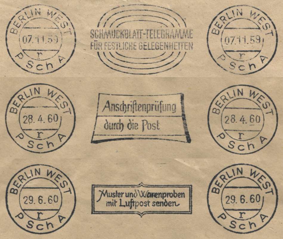 Nun meine Bitte an alle: Ich bin an Abbildungen aller Maschinenstempelabdrucke des Postscheckamts Berlin West aus dem o.g. Zeitraum interessiert. Die Abbildungen sollten das Datum den Unterscheidungsbuchstaben des Tagesstempels sowie den oder die jeweiligen Werbeeinsätze erkennen lassen. Vielen Dank. Sollte jemand solche Belege abgeben wollen, bitte ich um Kontaktaufnahme per PN.
