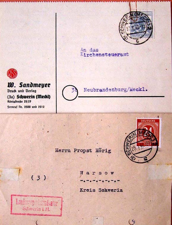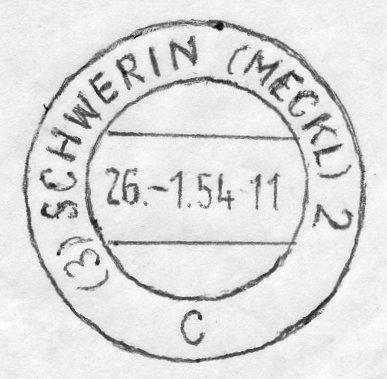 da ich "postalischer Heimatsammler" von Schwerin bin, habe ich mal nach dem Stempel geguckt. Er ist auf einigen Belegen aus dem Jahr 1947 zu finden - siehe Anhang.